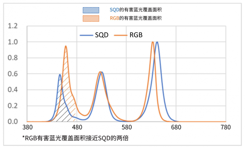 第二种是SQD黑科技,堪称“科学护眼派”,走的是“治本”路线。它不玩波段偏移的花活,而是直接从源头降低蓝光的整体强度,把有害蓝光能量压减到国标安全范围内,就算长时间观看,眼睛也不会发酸发涩。有实测数据为证,RGB方案的有害蓝光能量,差不多是SQD的近两倍。