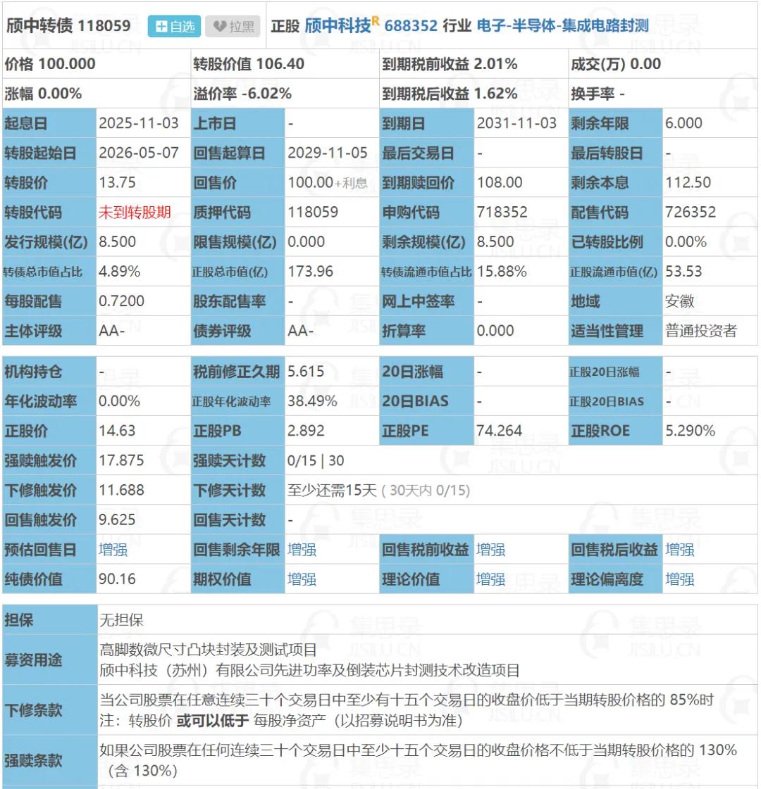 颀中科技周五收盘价14.63,转股价106.4,转股价值=转债面值/转股价*正股价=100/13.75*14.63=106.4,转股价值一般,可转债转股价值越高越好。