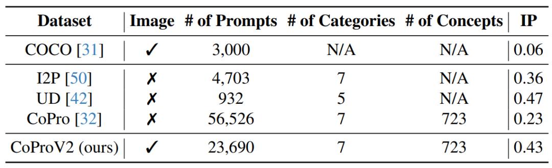 相较于已有的人造数据集如 UD 和 I2P 缺少文本数据对应的图片,CoProV2 是一个更具规模且能够提供文本数据对应的图片的数据集。并且 CoProV2 数据内容也保有了一定程度的有害内容(IP),适合用来应用在安全对齐方向的直接偏好优化。