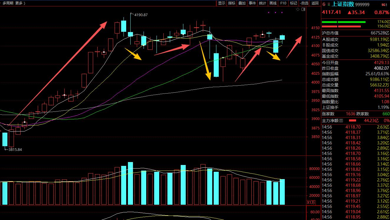 大A今日喜迎马年开门红:高开一举夺回4100点阵地,开盘下杀尔后回升,全天几乎横盘震荡;截止收盘,上证涨0.87%,收报4117.41点;深证成指涨1.36%,收报14291.57点;创业板指涨0.99%,收报3308.26点。全市成交22184亿,较上一交易日放量2193亿。