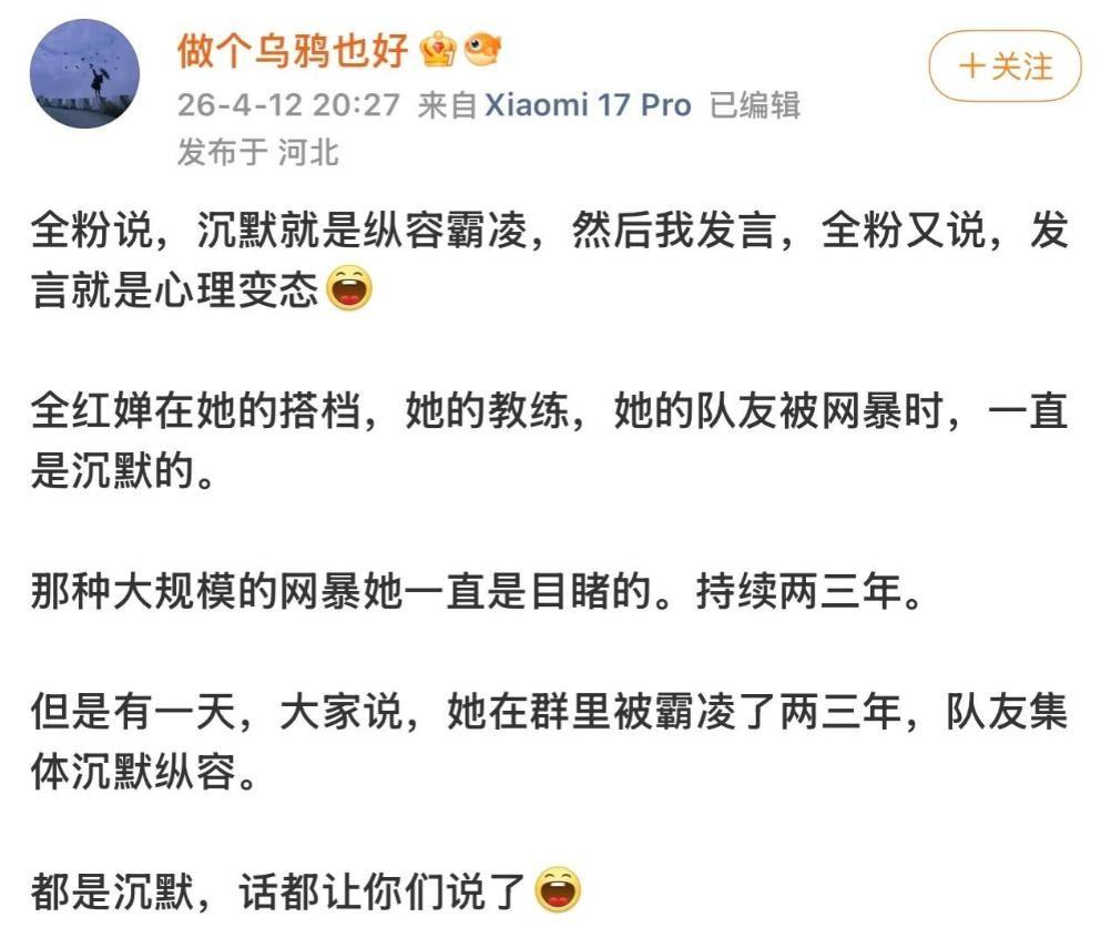紧接着她更是直言,当初队友被网暴的时候,全红婵一声不吭,现在轮到自己被攻击了才站出来维权,暗指她搞双重标准。