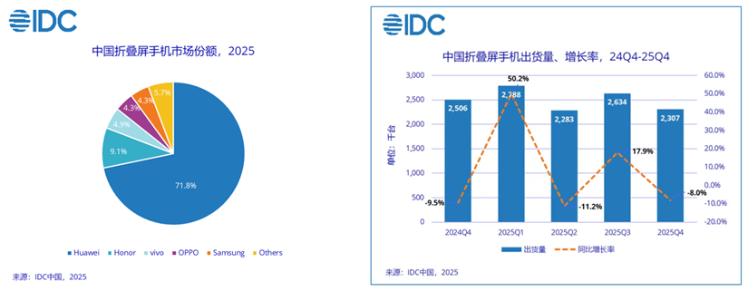 从市场份额数据来看,据IDC发布的调研报告,2025年国内折叠屏出货量继续增长,华为全年以71.8%的市场份额实现断层式领先;位居第二的荣耀份额为9.1%,而OPPO、vivo、三星等其余品牌份额合计尚不足20%。如果看单季度数据,华为折叠屏在2025年三个季度中市场占比均超70%,行业龙头地位极为稳固。
