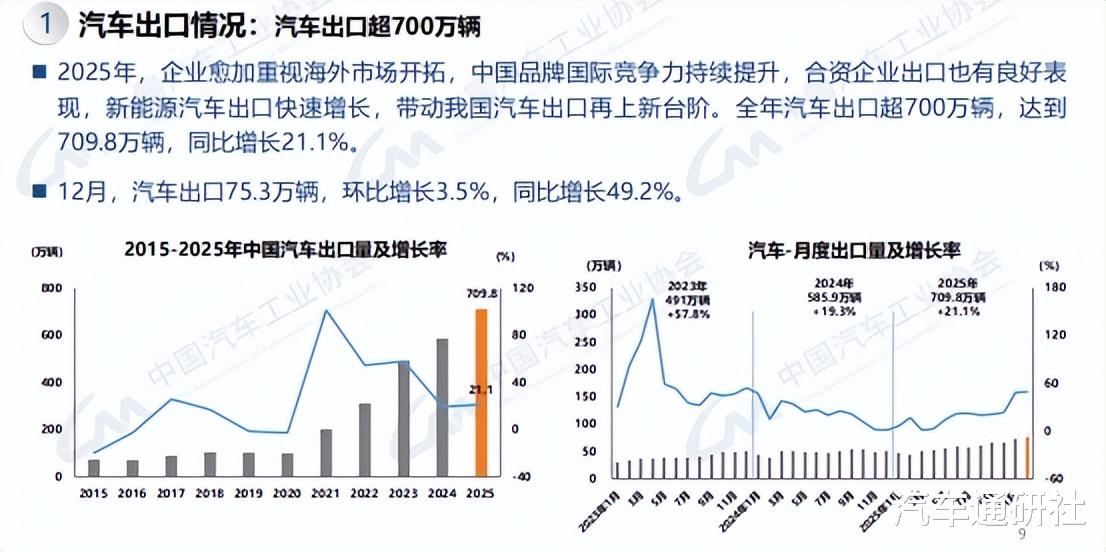 2025年,中国汽车出海迎来里程碑式突破,全年出口量达709.8万辆,同比增长21.1%,较2024年的585.9万辆和2023年的491万辆取得了跨越式的增长。