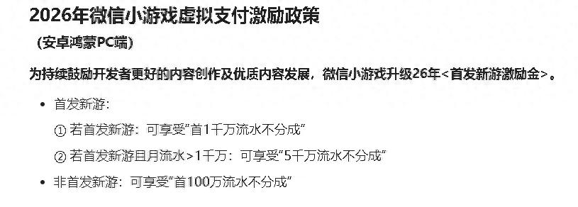 今日,微信小游戏宣布再次升级2026年IAP激励计划。此次新政通过两阶段的让利,支持优质游戏在微信平台首发与长线运营,新游首发最高5000万不分成,可获2000万元激励金。
