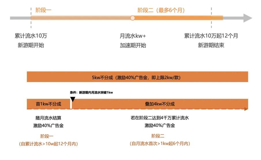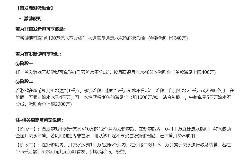 此次政策调整最大的升级点,在于大幅拉高了首发新游的激励天花板。属于首发新游的游戏可享受两阶段奖励:阶段一,游戏在累计流水超10万起的12个月内,可享受首1000万流水不分成,单款最高可获得400万激励金。