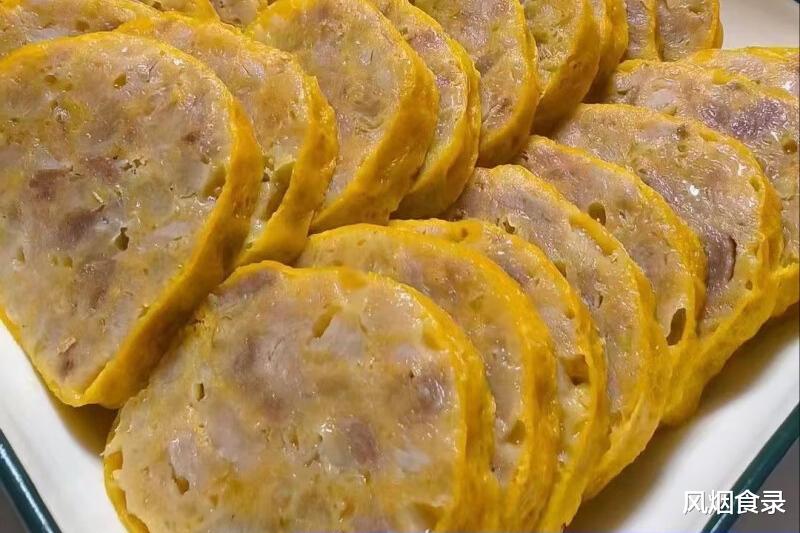 蛋液摊成薄皮,肉馅拌红薯粉,裹紧后扎孔上笼,配芋儿红苕再蒸,灌上骨汤,切片!