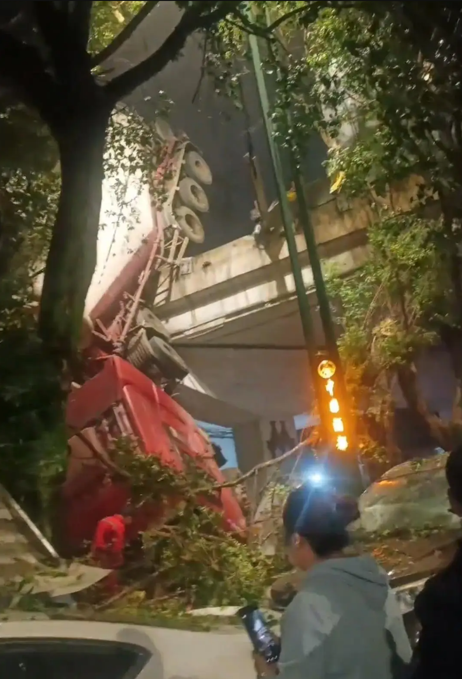 事故现场画面显示,罐车车尾仍悬在高速桥面,车头则重重砸向路面,压住了多辆停放在路边的车辆。据目击者反映,事发时曾听到一声巨响,随后引来不少群众围观。