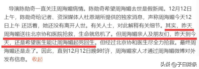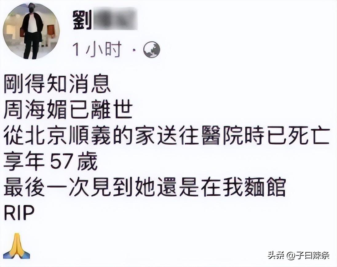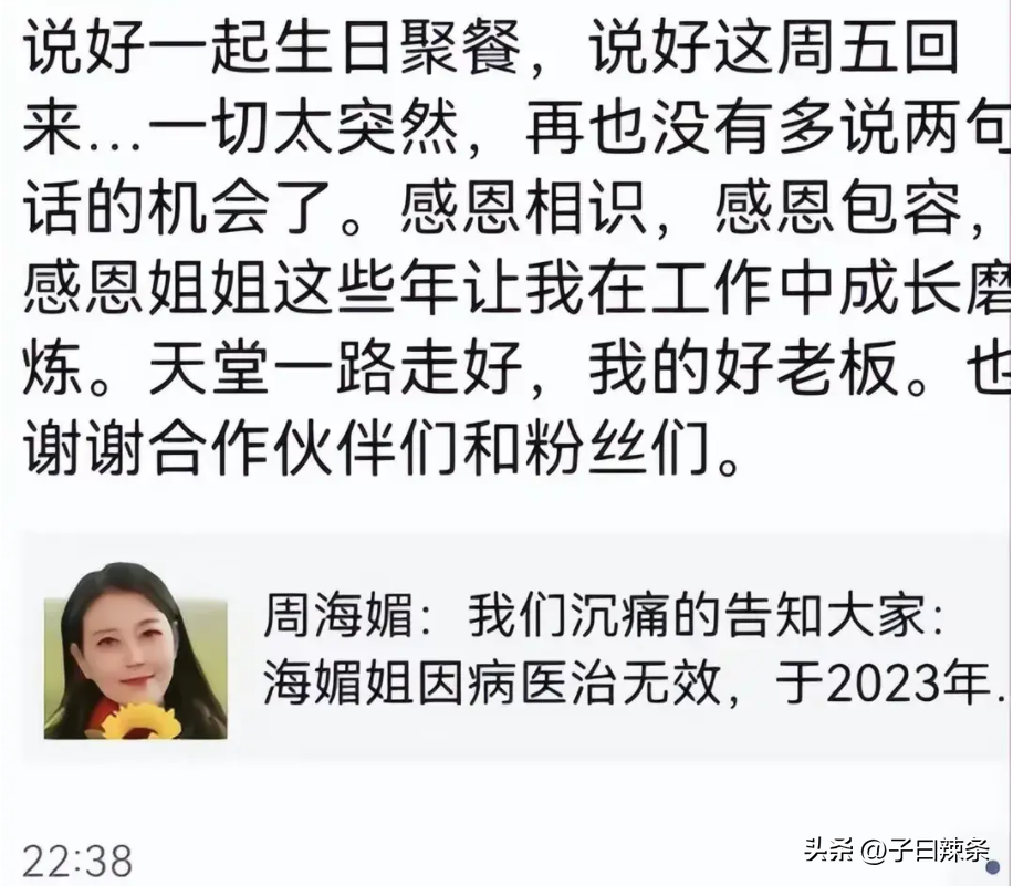 等一切弄清楚之后,才公布了消息。这也是为什么周海媚离世一天后,家属才公布消息的原因。