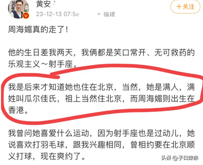 不过,这并不妨碍我告诉你一些关于周海媚的有趣事情。你知道她住在北京是因为她的祖上本来就是这边的吗?她是满族,原本姓氏叫做“瓜尔佳氏”,属于镶黄旗的。
