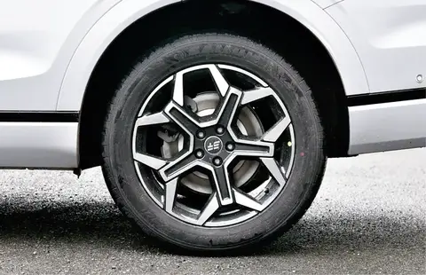 车身侧面,修长的线条与2820mm的轴距营造出稳健的姿态。银色车顶行李架与镀铬车窗装饰条相得益彰,既提升了实用性,又增添了精致感。半隐藏式门把手不仅降低了风阻,还让车身侧面更加整洁流畅。19英寸星芒式轮毂搭配低滚阻轮胎,兼顾了美观与滤震性能。