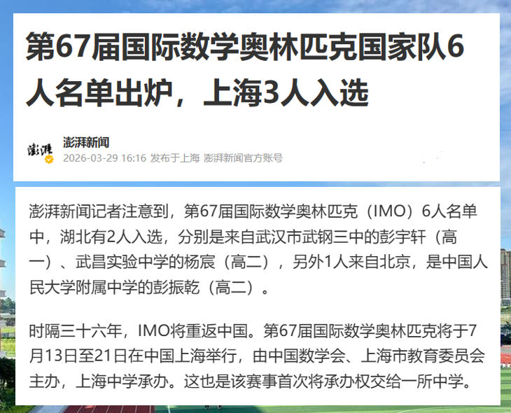 更让湖北教育圈捂脸的是那份国家队名单:6个席位,上海独占3席,几乎半壁江山;而作为传统“奥数军团”的湖北,只有武钢三中的彭宇轩(高一)和省实验的杨宸(高二)这两根独苗突围。(源自澎湃新闻3月29日报道)
