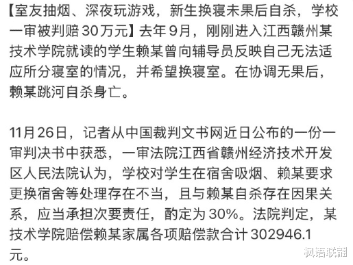 法院最终判决学校承担30%过错责任,赔偿赖某家人约30万。