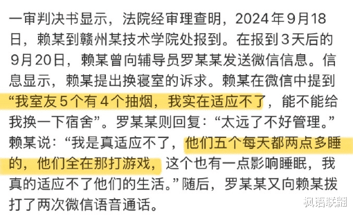 一天后,赖某就提出换宿舍;