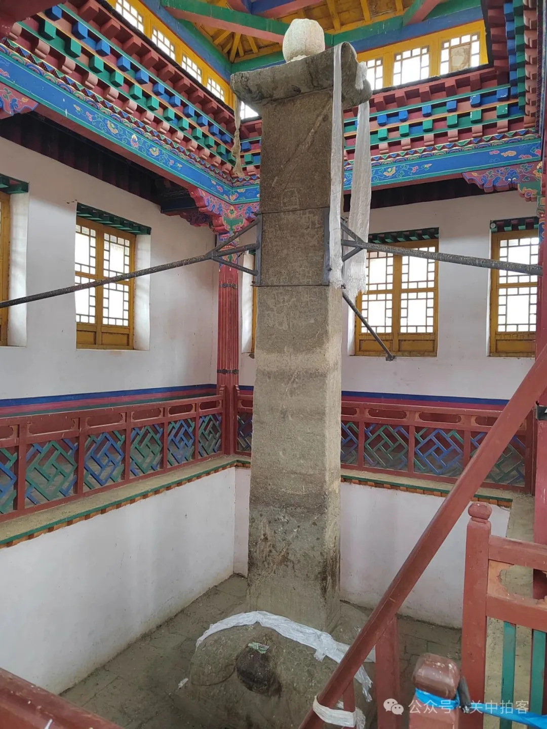 这里的大门虚掩,轻轻推开,便可进入。石碑通高7.18米,由碑盖、碑身、碑座组成,上小下大,呈长条状。在石碑表面,刻着藏文书写的59行碑文,赞美赤德松赞的伟大政绩。