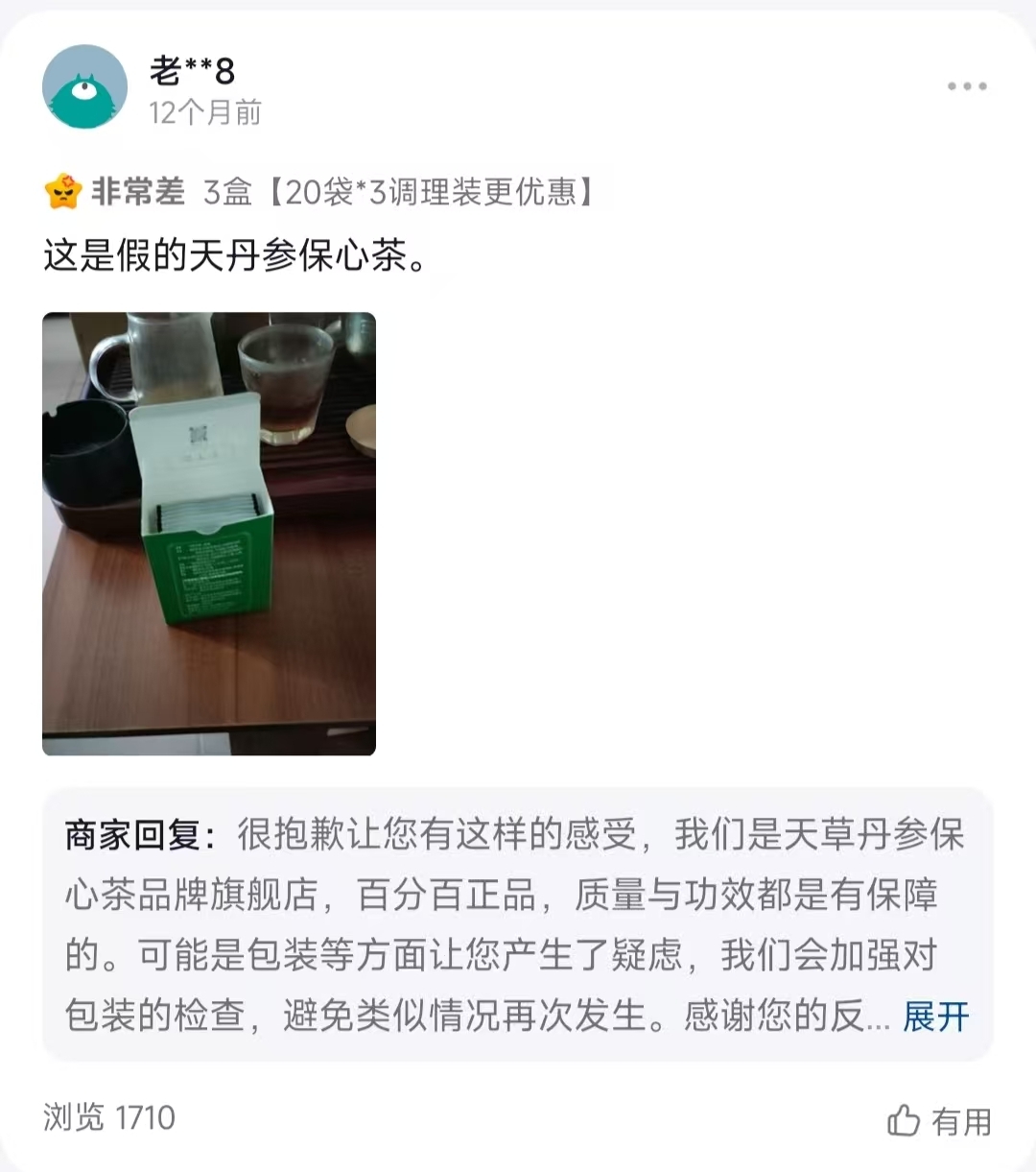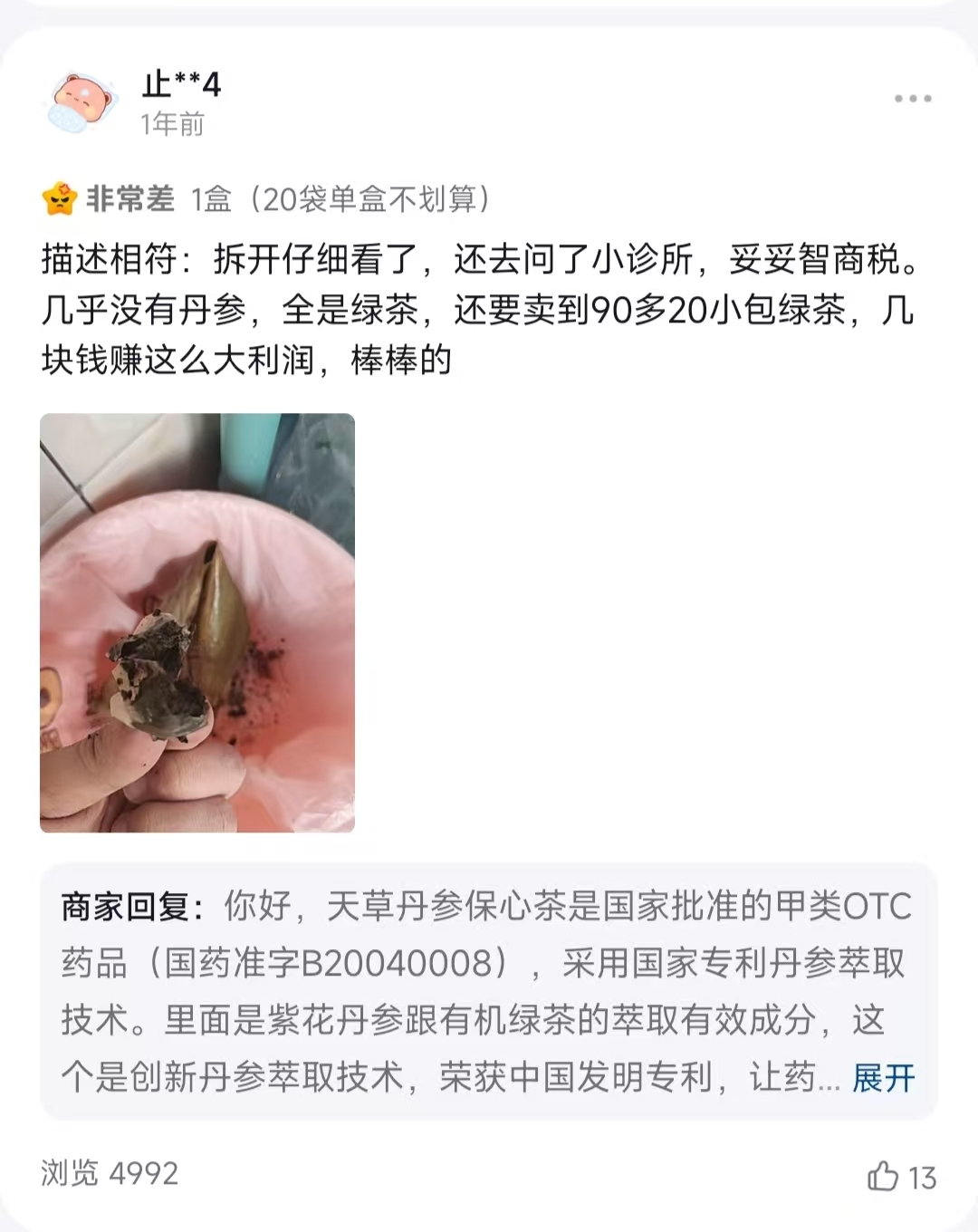 - 产品真伪质疑:更有消费者直接晒出产品图片,坚称所购为“假的天丹参保心茶”。面对指控,商家虽反复强调自己是“品牌旗舰店”,但消费者的疑虑并未因此消除。