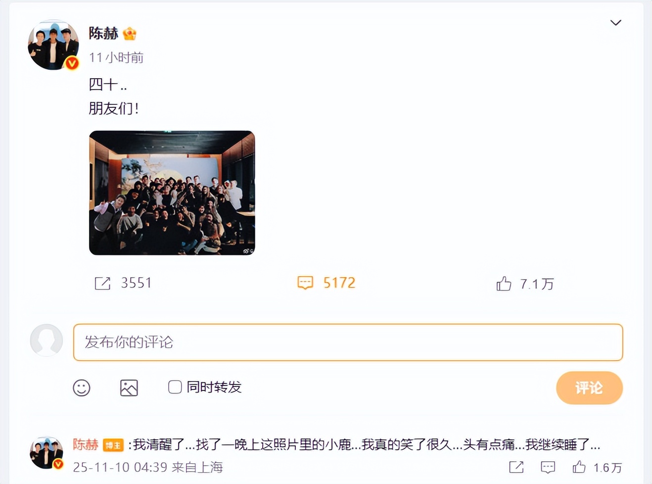 内娱的真实友情名场面,这次真的火出圈了!11月9日是陈赫40岁生日,他发了条微博配着照片,文案就一句“四十 朋友们!”,没成想直接把#全网找鹿晗#和#跑男三兄弟十年友情#两个话题顶到了热搜第一,全网实时讨论量一下就破了3亿。网友们都乐了,调侃说:“这哪是生日祝福啊,分明是大型‘找茬’现场,还顺带戳了波青春回忆!”