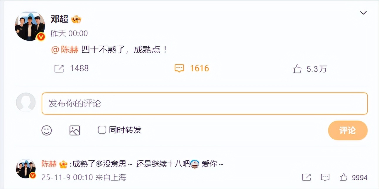 比起“找鹿晗”的热闹劲儿,三兄弟的庆生互动更像一场相声表演。零点刚过,邓超就卡点送祝福:“都四十不惑了,该成熟点了!”陈赫秒回:“成熟了多没意思啊~还是继续当‘十八岁’挺好”,那股子不服输的劲儿把网友都逗乐了。