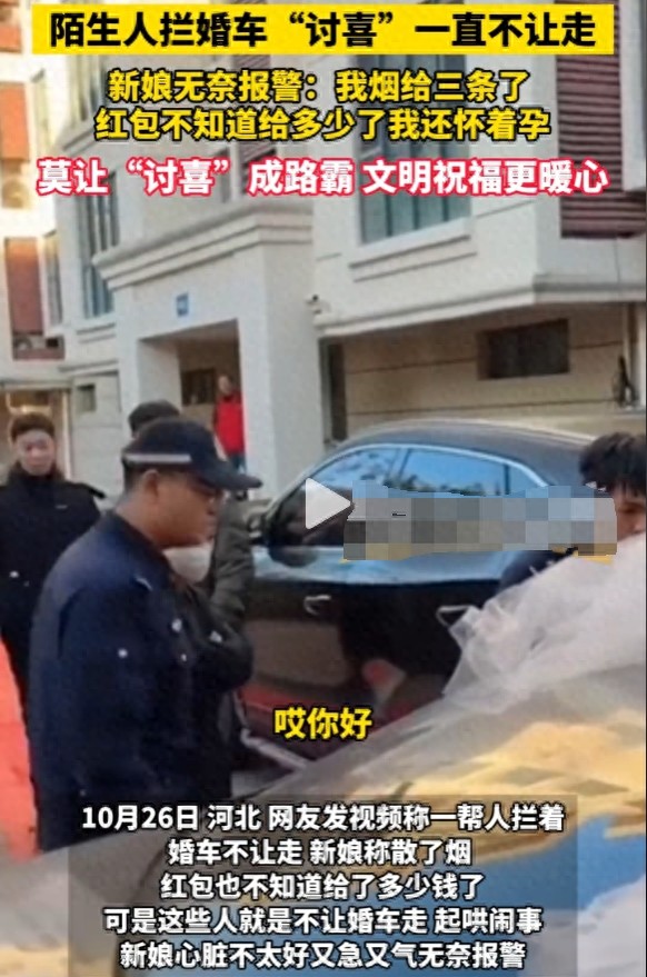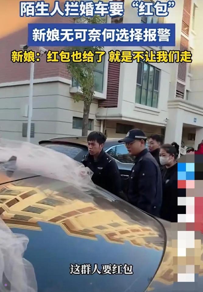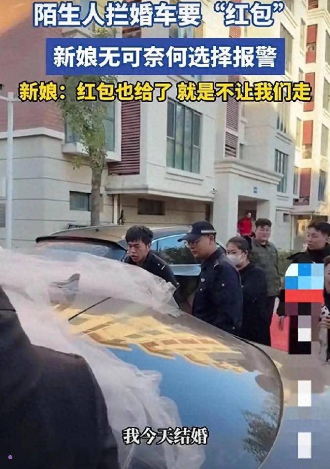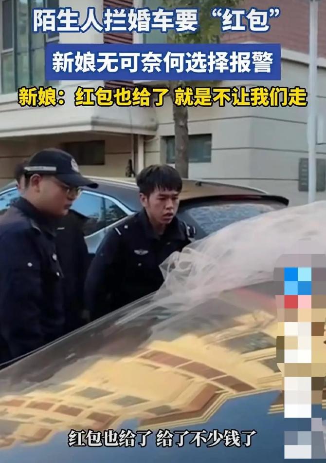 小两口结婚被陌生人拦婚车要”红包“。新娘给了红包后还是不让走,新娘无可奈何只能选择报警。