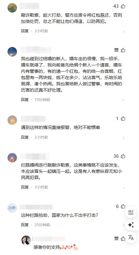 不少网友看了都吐槽,自己结婚时也碰到过这种 “路霸”,根本不是来沾喜气的,就是来碰瓷似的要钱。有网友说,当初拦车的人张口就要大红包,给少了就往引擎盖上躺,明明是一辈子就一次的喜事,硬生生被搅得心里添堵,真是没天理。