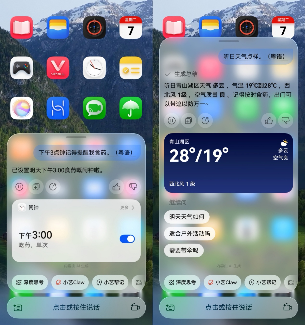比如直接说“下午3点钟记得提醒我食药。”小艺立马用粤语回应并设好提醒。外婆问天气“听日天气点样”,小艺也会用粤语详细播报,还贴心叮嘱按时吃药、出门带伞。外婆说跟小艺对话像在跟老乡聊天,不用学普通话或者费力打字。