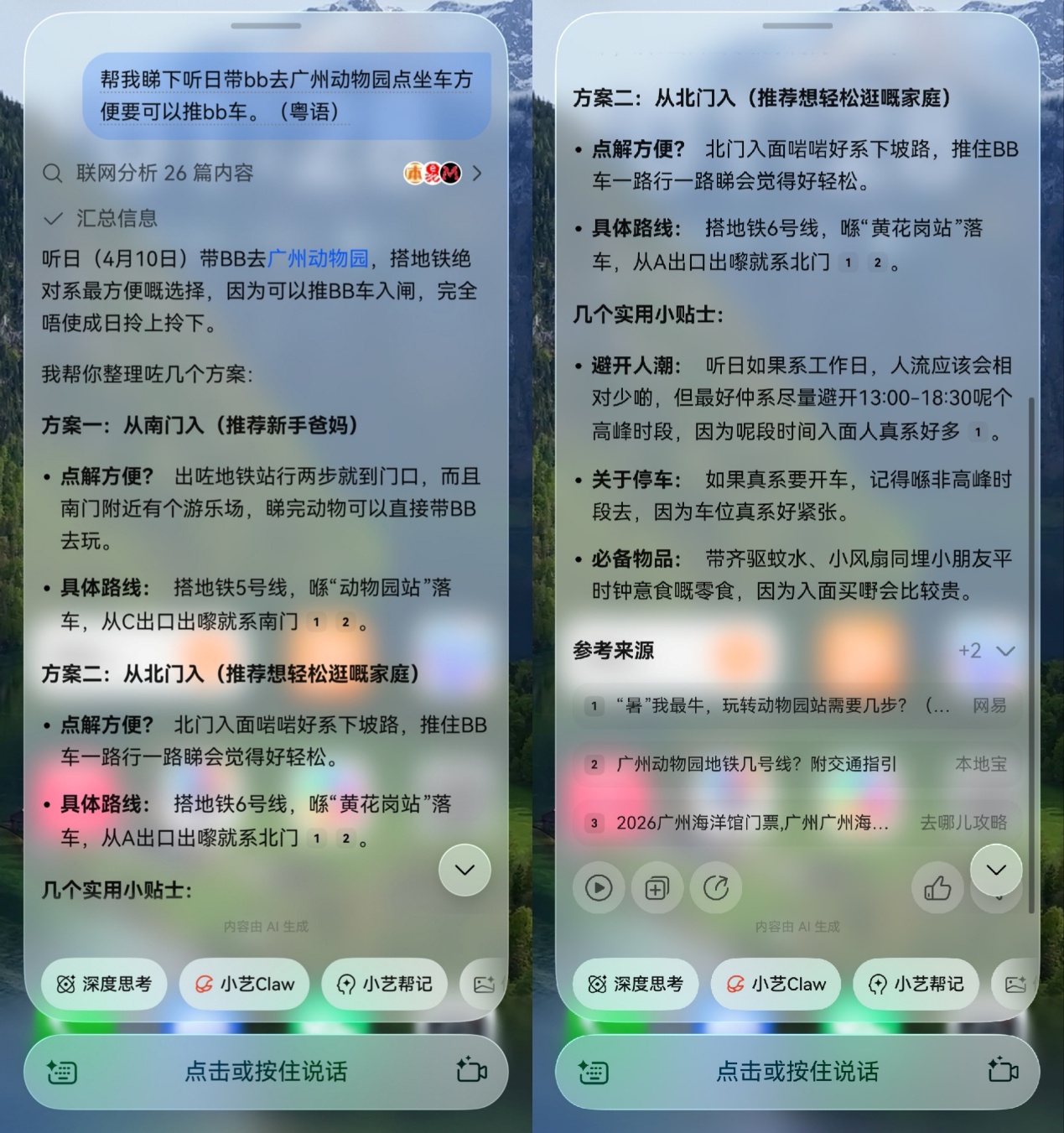 上个周末天气好,想着一起去动物园逛逛。我又不在家,怕她搞不定路线,结果她对着手机用粤语问了一句:“帮我睇下听日带 BB 去广州动物园点坐车方便,要可以推 BB 车嘅。”小艺马上帮她联网搜了一圈,几秒钟就把方案列出来了。