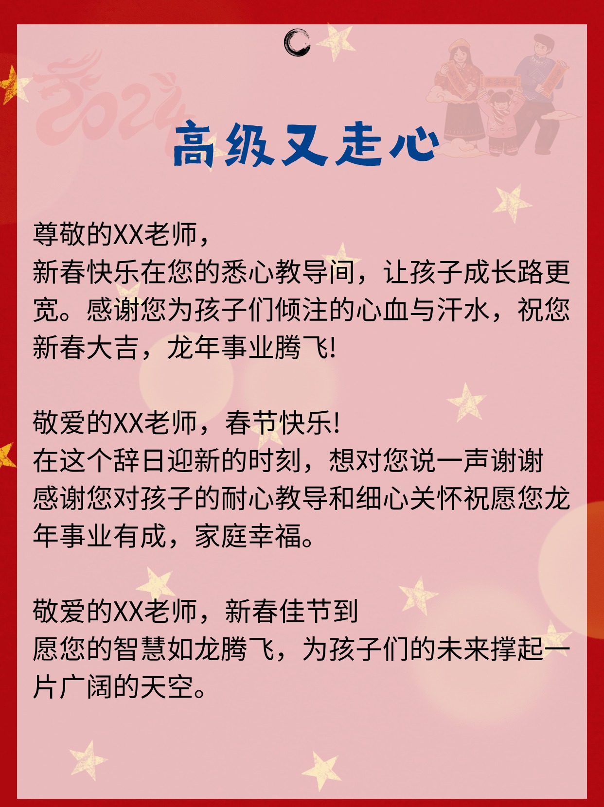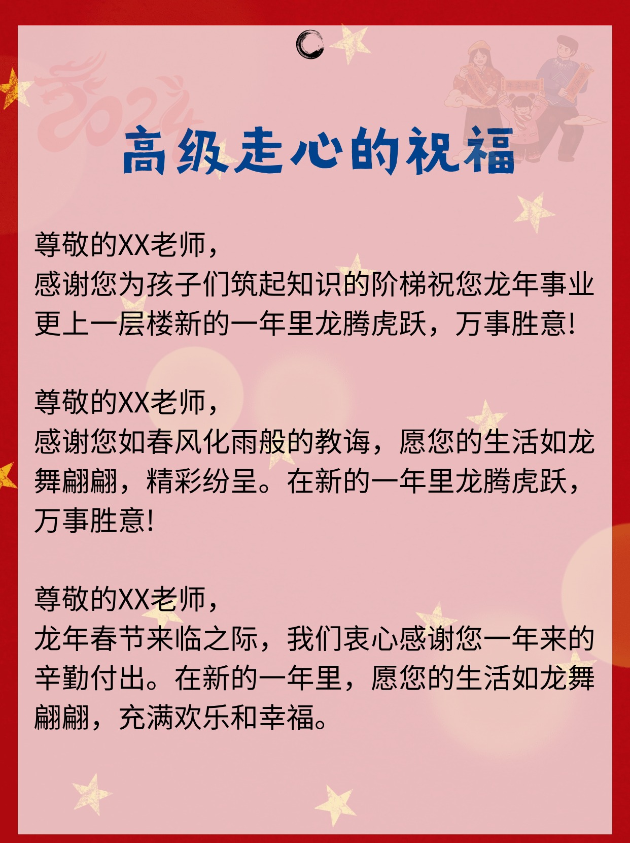 🌟随着春节的脚步声越来越近,家家户户都沉浸在浓浓的年味儿中。而在这样的时刻,给老师发送祝福语,既是一种礼貌,也是一种情感的表达。那么,如何才能写出既高级又走心的祝福呢?别着急,今天我就来给大家支几招!🎁首先,我们要明白,祝福语的目的不仅仅是表达感激之情,更是要让老师感受到我们的真诚和用心。所以,在写祝福语的时候,我们要尽可能地结合实际情况,回忆与老师相处的点滴时光,让祝福语更加具有针对性和情感共鸣。📖接下来,我们来看看如何写出高级的祝福语。首先,要注意用词的精准和优美,避免使用过于口语化和随意的表达。其次,可以适当运用一些修辞手法,如排比、对仗等,让祝福语更有文采和韵味。最后,要注意结构和逻辑的清晰,让祝福语更加易于理解和记忆。💌最后,让我们一起来看看几个实际的例子吧!比如,“尊敬的老师,感谢您一直以来的辛勤付出和无私奉献。愿您在新的一年里身体健康,工作顺利,家庭幸福!”这个祝福语就比较简洁明了,同时又表达了我们对老师的感激之情。再比如,“亲爱的老师,您用智慧点亮了我们前进的道路,用爱心陪伴我们成长。祝您在新的一年里事业蒸蒸日上,家庭美满幸福!”这个祝福语则更加注重情感的表达,让人感受到我们对老师的深厚情感。🎉总之,给老师发送祝福语是一种有意义的表达方式,让我们用心去写,用情感去表达,让我们的祝福成为老师新一年中最美好的回忆!在此也祝大家春节快乐,阖家幸福!🎉🎉