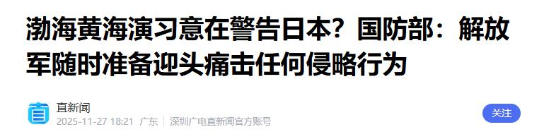 1.《渤海黄海演习意在警告日本?国防部:解放军随时准备迎头痛击任何侵略行为》2025-11-27 18:21 | 来源:直新闻