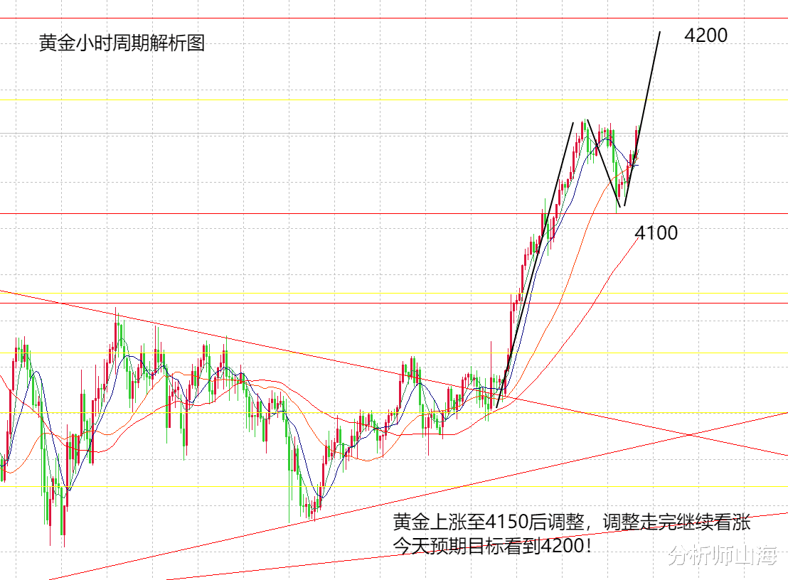 这波黄金的多头从3900就开始提示大家布局多单看涨,截至到目前为止,上涨力度已经达到山海预期的第一目标点4150,那么,下一波的上涨第二目标点4300。经过周二美盘的调整,大家可以看到,回落至4100后无力,基本形成第二阶段的上涨支撑点,在这个平台内,黄金可以继续上涨,技术面就看到日线周期布林上轨压制点4300附近,H4周期的表现也符合单边行情的走势,经过回落调整,k线还是收在均线之上,那么,日内上涨的高点至少要试探布林上轨的压制点4200附近,所以,今天阶段性的上涨可以先看到4200附近,如果周四,周五延续上涨的话,再看4300高点。对于小周期而言,4100已经形成强势支撑,那么,下方的支撑点现在可以调整至4125附近,日内回落至此点位可考虑继续做多看涨,同样的节奏,亚欧盘看涨,美盘开盘后看是否有较大的调整力度,调整力度过大还可以接多,调整力度不大连续到午夜盘继续看涨。