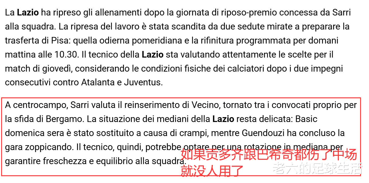 球队方面,他们的伤病依旧非常严重,大部分伤员集中在中场,上场与尤文的比赛替补中场巴希奇腿抽筋被换下,结束的时候核心中场贡多齐一瘸一拐的离开球场,本场萨里可能会做出轮换调整。