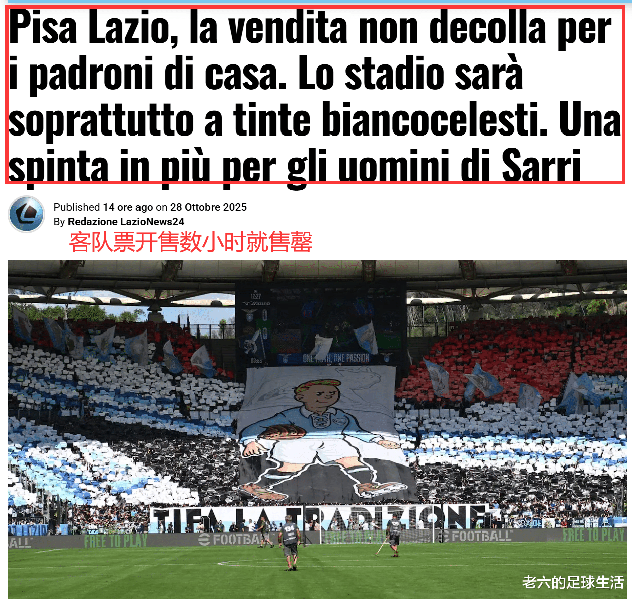 本场比赛两队的球迷是期待已久,尤其是拉齐奥球迷,他们希望球队可以借助比萨这一弱旅来扫清球队状态不佳的阴霾,因此客场门票在开售数小时内就全部售罄了。