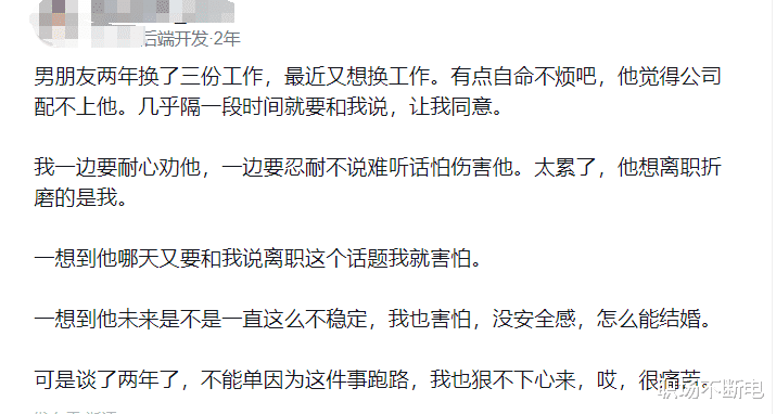 一个女生在网上求助:谈了两年的男友两年换了三份工作,最近又想换工作,一直觉得公司配不上他,让自己同意。一想到他的未来充满了不稳定的因素,自己就很害怕,没有安全感。要是因为这个事情跑路,也不合适,但是也狠不下心了,怎么破?