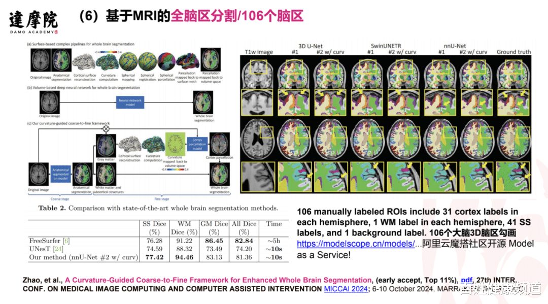 此外,吕乐博士在会议上还介绍了两项突破性的成果:全身器官分割模型和全脑区分割模型。全身器官分割模型可以识别并分割人体236个“器官”,涵盖了淋巴站等非生理结构的临床区域,能够有效预测患者对特定治疗的反应,制定更优化的治疗方案,并为可能不响应初始治疗的患者提前规划替代方案。而全脑区分割模型则可利用MRI数据,在大约10秒内快速准确地识别大脑的106个区域,为脑部疾病提供了新的诊断和治疗方法,实现更高的医疗效率和精确度。