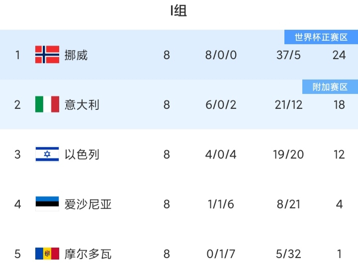 本届世预赛,意大利与挪威、爱沙尼亚、以色列、摩尔多瓦一起分在了I组。如果是20年前的意大利队,可能他们早提前晋级世界杯了,可惜没有如果,现在的意大利还是前面几届只能混迹附加赛的意大利。虽然他们世界排名高居第9位,但还是2次输给了世界第29挪威。特别是这次主场对阵挪威,意大利需要至少净胜9球才能直通2026世界杯,不过葡萄牙打出了9-1的比分,而意大利则是再次惨败。