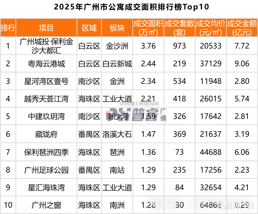 2025年广州公寓成交面积排行榜TOP10中,上榜的项目超一半都位于中心城区,其中海珠最多。
