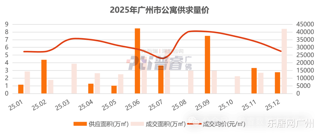 据普睿数智广佛区域数据显示,2025年,广州全年公寓供应33.60万㎡,同比减少18%。成交43.50万㎡,同比减少28%,成交均价30978元/㎡,同比下降9%。