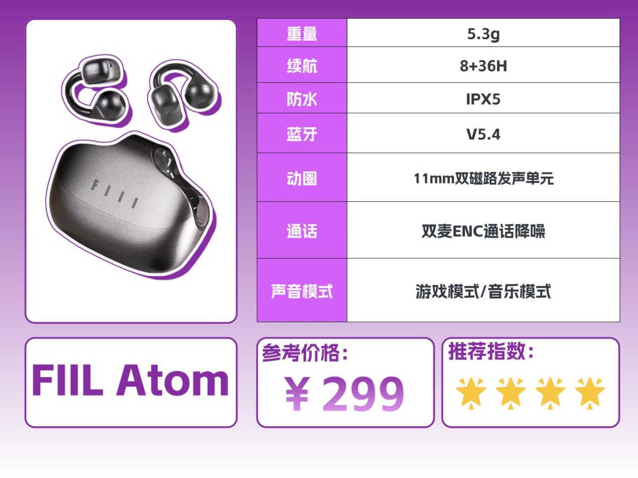要是更看重续航和外观的百搭性,FIIL Atom 值得考虑。8+36 小时的续航不用总充电,科技感的外观和黑白配色也很适合日常使用。不过它的音质和防漏音效果比较一般,适合对音质要求不高,主要在日常通勤、缓慢活动时使用的人。