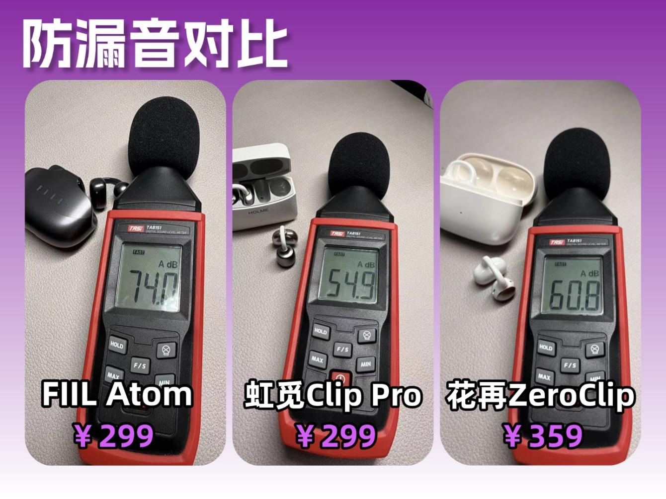 防漏音方面,虹觅Clip Pro做得最好。它有个自研的防漏音模式,通过反向声波抵消漏出的声音,在安静的地方用特别适合,声音拉到一半往上也只有一点点动静。FIIL Atom 和花再ZeroClip虽然也有相关处理,但整体效果听着不如虹觅的防漏音模式,在安静的代发用,旁边的人可能会隐约听到一点声音,不过音量调小些就好多了。