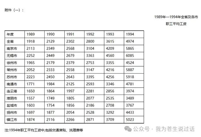 1995年5月5日,《江苏省劳动局关于印发江苏省各市1989至1994年职工平均工资和城镇居民生活费用价格指数的通知》显示,1989年至1994年,苏州职工年平均工资分别为:2223元、2450元、2643元、3395元、4256元、5918元,换算成月平均工资约为:185.25元、204元、220.25元、283元、355元、493元。