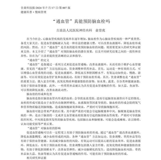 参考资料:[1] 俞登虎.“通血管”真能预防脑血栓吗[N].甘肃科技报,2024-07-17