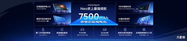 Neo11 实现 Neo 史上最强续航表现,搭载配备了第二代半固态电池技术和第四代硅负极技术的 7500mAh 超薄蓝海电池,即使在 -20℃ ~ 40℃ 的环境中,依然能稳定持久放电,并配备 100W 超快闪充且支持 PPS 和 PD 快充协议,让充电更自在;全新升级的全局直驱供电 2.0,支持智能温控,做到发热更低、损耗更少,有效延缓电池老化,边充边玩也安心。