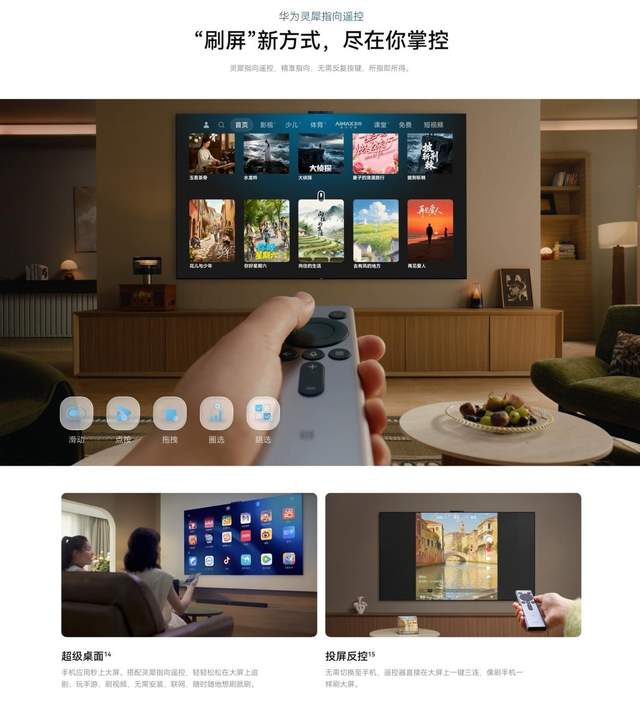 其配备的华为灵犀指向遥控,通过UWB + IMU + 蓝牙Plus等先进技术实现了“所指即所得”。你可以像拿激光笔一样在屏幕上指哪点哪,甚至直接在遥控器触控板上滑动、拖拽,这种感觉就像是在客厅里操控一台“巨幕手机”。