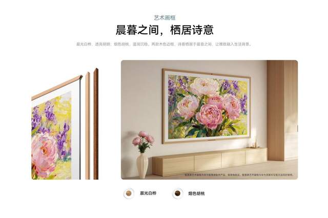 如果你选配了“晨光白桦”或“烟色胡桃”的艺术画框,再开启智慧画廊模式,莫奈的睡莲、阿尔卑斯的雪山,或是你自己的家庭照片墙,都能在屏幕上静静流淌。此时,电视不再是闲置时冷冰冰的黑方块,而是提升家居格调的流动艺术廊。