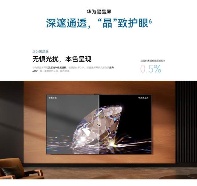 华为Vision智慧屏 6这次的核心大招,就是全球首发的Super MiniLED黑晶屏。它创新性地采用了双层纳米低反镀膜技术,将整机反射率压制到了1.72%。这意味着即使在强光直射的情况下,电视画面依然通透,不会因为光线散射导致画面模糊泛白。