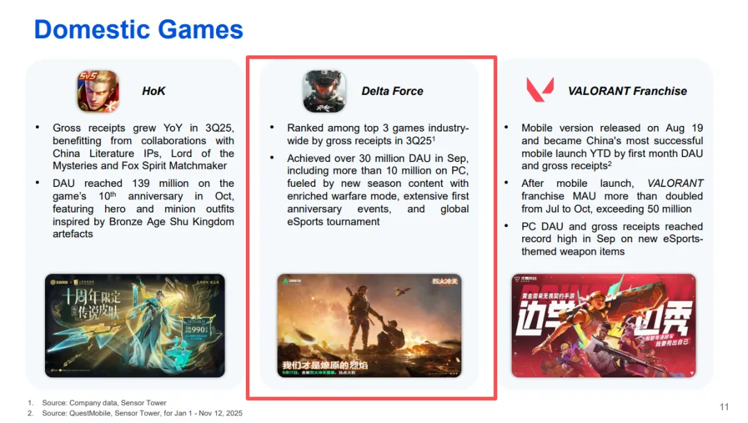 腾讯的公开财报上,无论是半年报还是近期发表的Q3季报,无不点名表扬《三角洲行动》的成绩。财报中直接表示,《三角洲行动》本季度流水位居行业前三,推动了游戏收入增长,而在3000万的DAU里,也有足足1000万来自PC端的玩家。