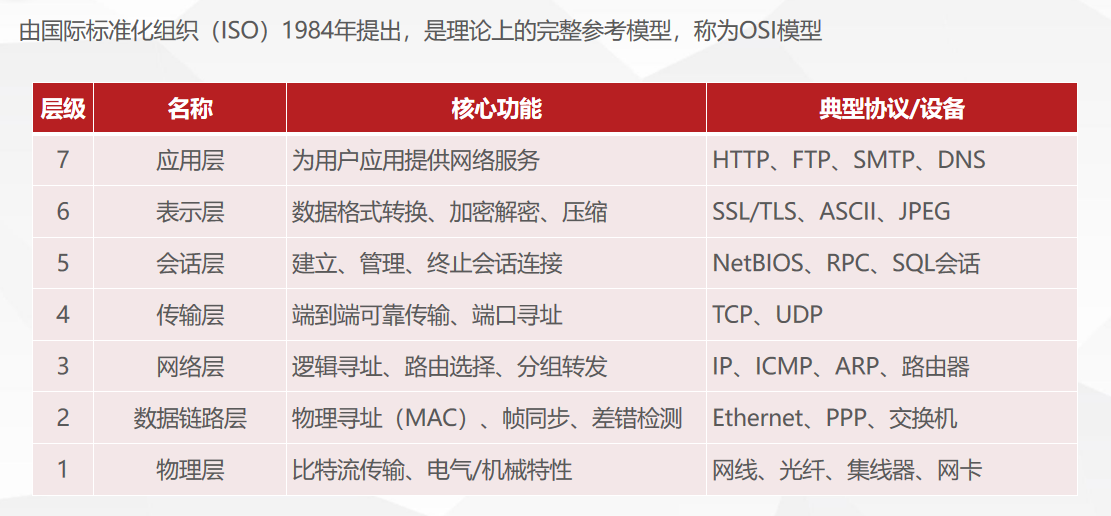 第 3 层:传输层:对应 OSI 模型的传输层,负责端到端通信与可靠性控制,TCP(可靠传输)和 UDP(高速传输)是两大核心协议,分别适配文件传输、视频通话等不同业务场景。