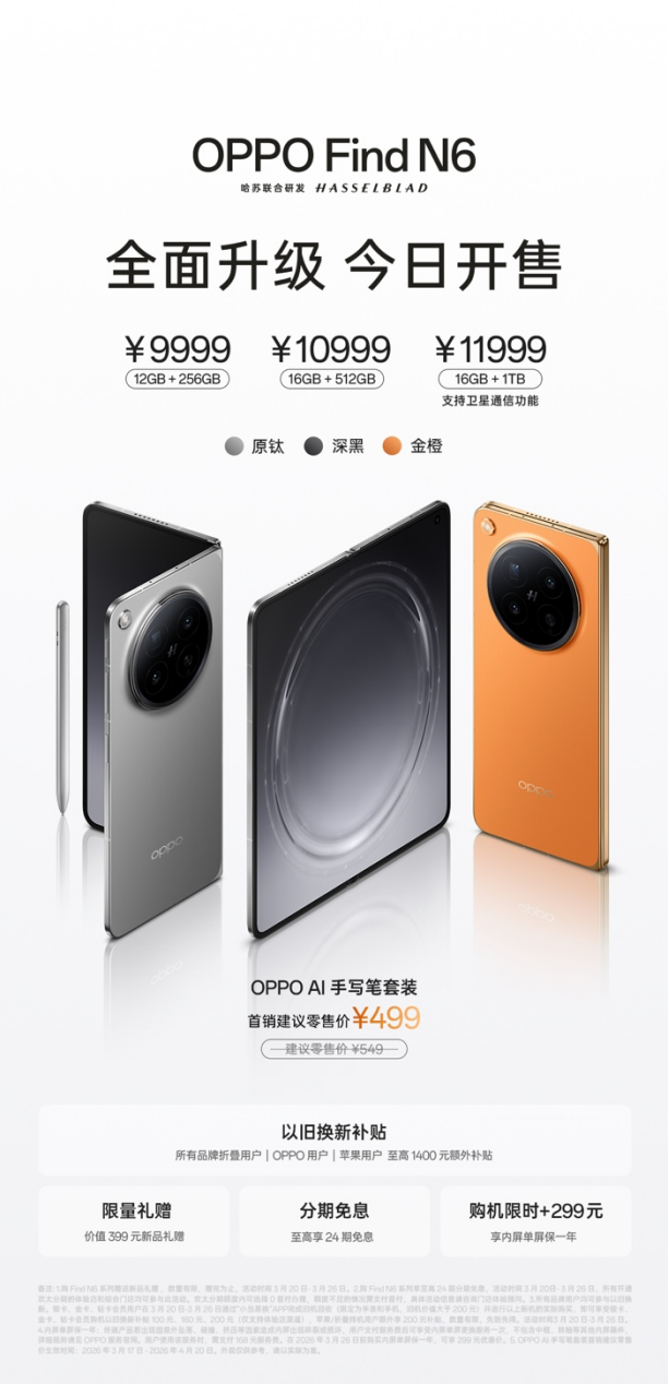 价格方面,全新OPPO Find N6售价9999元起。现在下单福利超多:所有品牌折叠屏、OPPO及苹果用户以旧换新最高可享1400元补贴,还支持至高24期分期免息,首销期间购机更赠价值399元的专属礼包。心动的朋友,快去OPPO官方商城或线下门店体验一下这块“平整如镜”的未来手机吧!