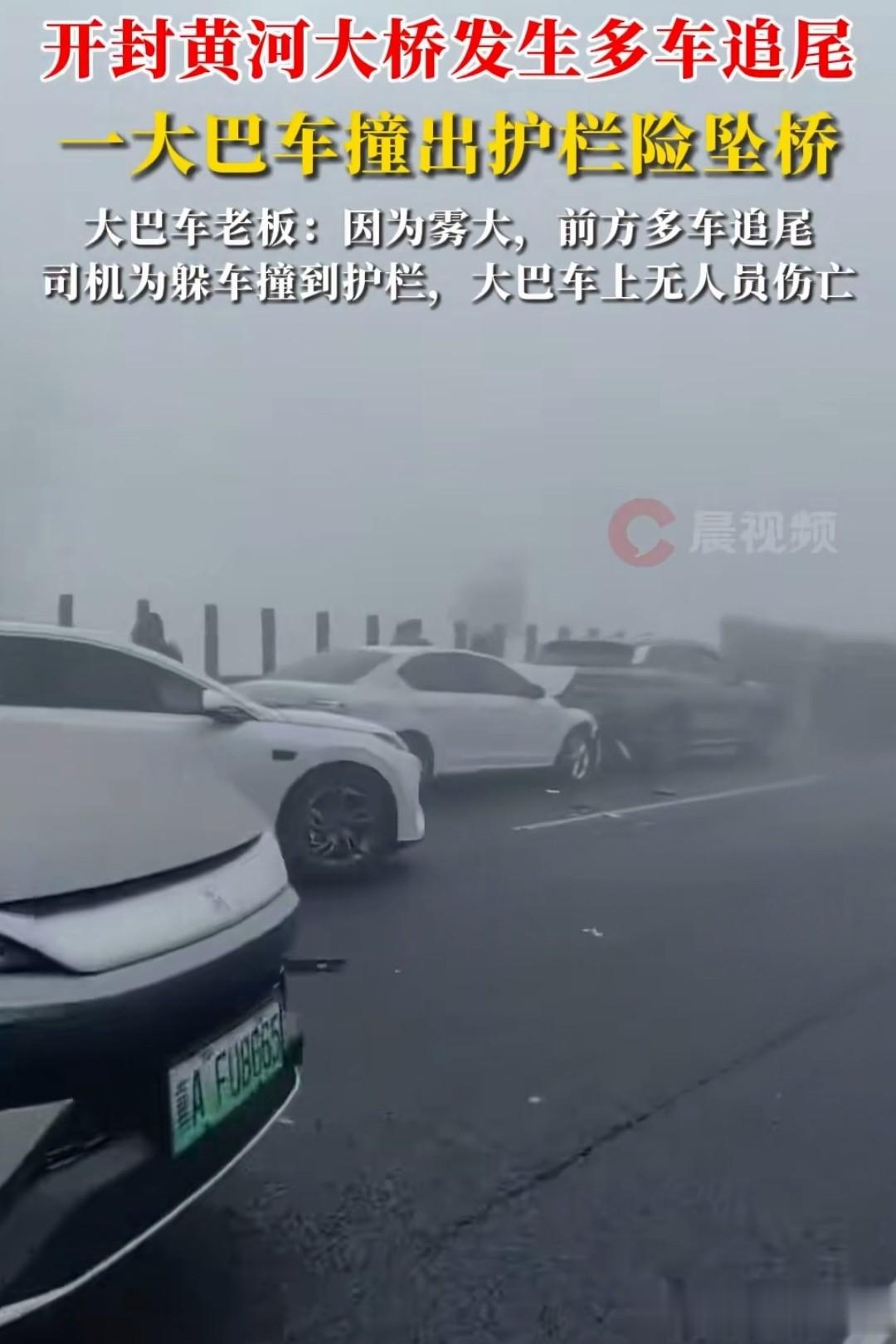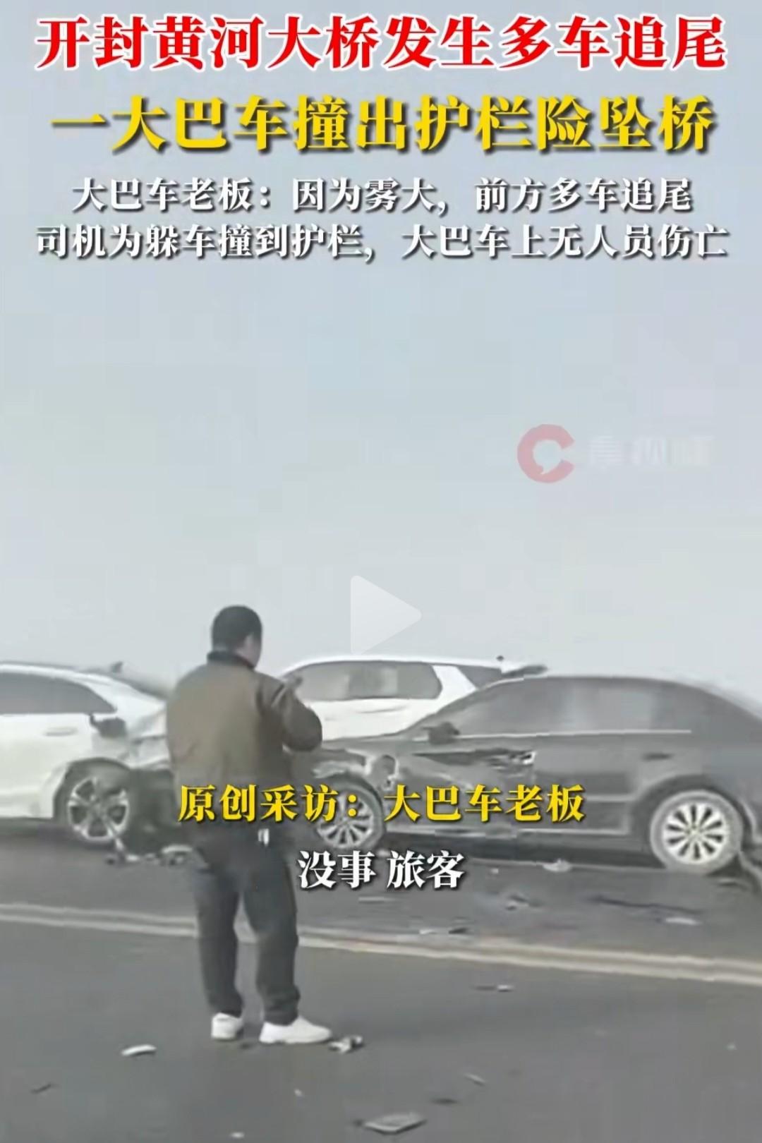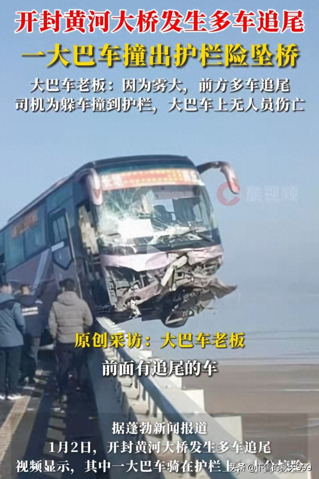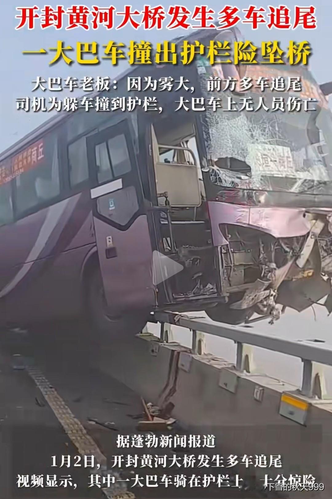 当天早上开封当地下起浓浓的大雾能见度很低,但是大雾也抵挡不了大家外出的热情,当时有众多车子经过黄河大桥,可能是由于大桥附近大雾特别浓的原因,大桥上突然发生了多车追尾事故,有一辆公交失控撞出护栏!公交车的半个车身包括车头悬空,差一点点坠就坠落桥下去了,看上去十分的惊险!