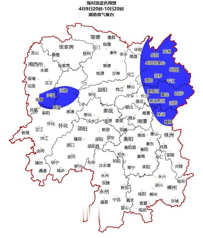 蓝色预警区域:望城区东部,长沙县大部,宁乡市西南部,浏阳市大部,石峰区西南部,天元区南部,渌口区西北部,攸县北部,醴陵市南部,北部,雨湖区西部,岳塘区东北部,湘潭县大部,湘乡市东部,韶山市东部,湘阴县南部,平江县大部,汨罗市南部,桃源县南部,赫山区大部,安化县西部,沅陵县东部。