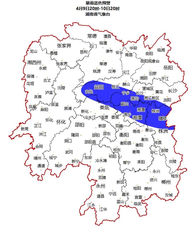 湖南省气象台04月09日16时发布暴雨蓝色预警:预计9日20时至10日20时,湘中部分地区将出现暴雨,其中株洲北部局地大暴雨(100-120毫米),并伴有短时强降水(最大小时雨强30-50毫米)、雷雨大风(阵风8级以上、局地10级以上)、冰雹等强对流天气,请加强防范。
