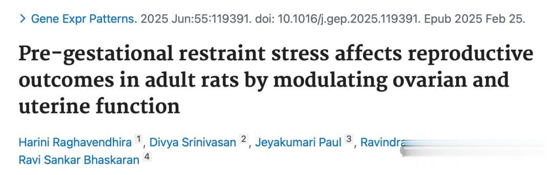 Pre-gestational restraint stress affects reproductive outcomes in adult rats by modulating ovarian and uterine function. Gene Expr Patterns. 2025 Jun;55:119391. doi: 10.1016/j.gep.2025.119391. Epub 2025 Feb 25.